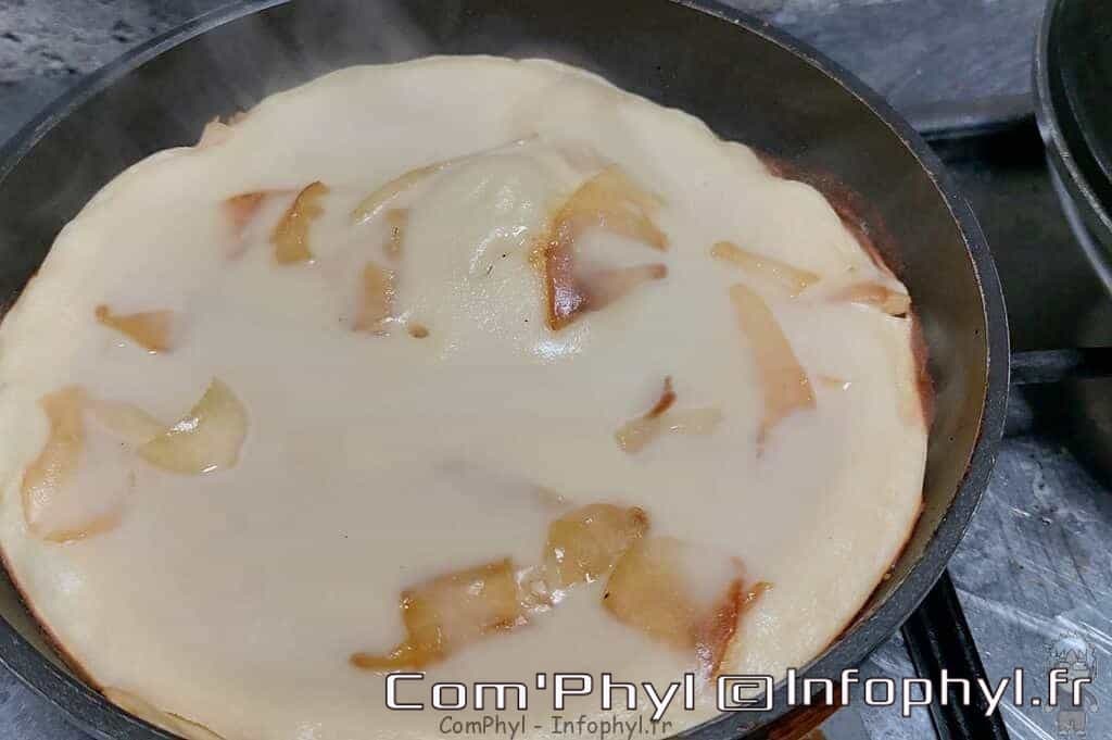 - Dans une poêle faire fondre un petit peu de beurre, ajouter les pommes en lamelles et soupoudrer de sucre laisser caraméliser en remuant. Verser une louche la pâte sur les pommes et couvrez la poêle laisser cuire à feu doux environs 5 à 7 minutes, en surveillant.50 g Sucre en poudre, 50 g Beurre, 3 Pomme